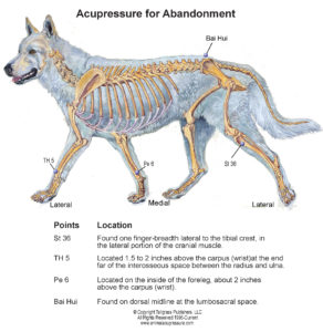 An acupressure session for a previously abandoned dog should include acupoints that help with digestion, overall health and well-being, and emotional issues (see chart at left).