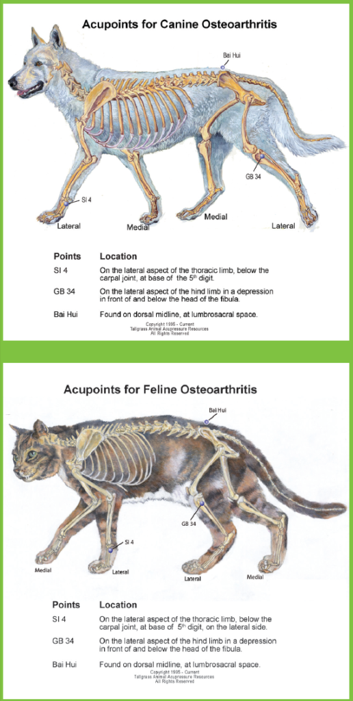 You can also help your animal offering her an acupressure session twice a week. Certain acupressure points are known to reduce inflammation and supply the necessary nutrients and energy to the joints to enhance flexibility and movement. By gently applying finger-pressure on the “acupoints” shown on the charts and discussed below, you can effectively lessen your dog or cat’s pain and and improve his quality of life.