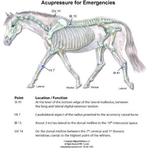 Acupressure can help your horse remain calm in any emergency, as long as you won’t be putting yourself at risk. The acupoints shown in the “Acupressure for Emergencies” chart can help support the horse’s respiration and heart rate as well as reduce fear and enhance calm. These acupoints have been used for horses in emergency situations for thousands of years.
