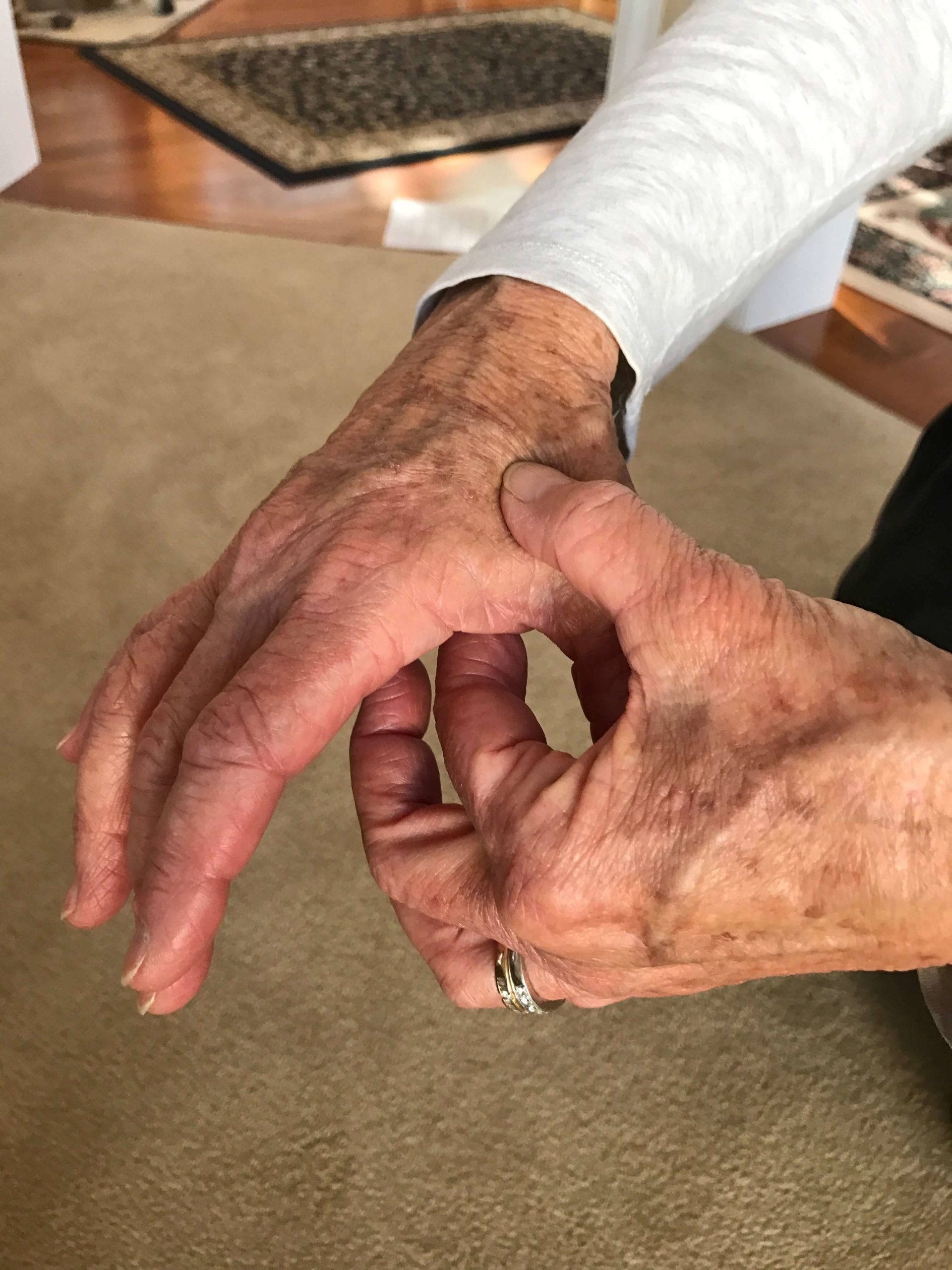 The acupoint Large Intestine 4 (LI 4), (He Gu in Chinese, known as “Adjoining Valley” in English) is located in the webbing between your thumb and forefinger. Place your thumb and forefinger on each side of the webbing on the opposite hand while taking three deep breaths in through your nose. Exhale through your mouth down to the bottom of your breath before taking the next breath. Repeat holding Large Intestine 4 on the opposite hand while performing deep, slow breathing three more times. Now you are ready to offer your horse help.