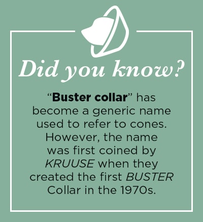 The first BUSTER collar, created in 1974 by Danish veterinary equipment company KRUUSE, made its debut as a simple non-transparent plastic cone. Since 1974, there have been several advancements in the design and manufacture of post-op care devices.