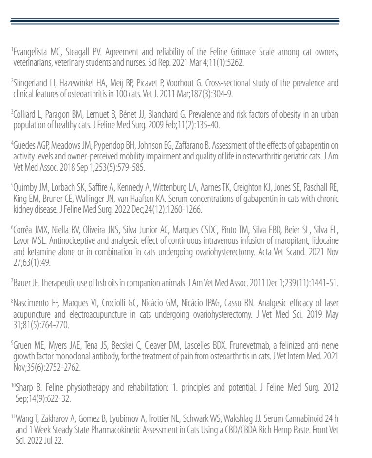Safety and efficacy data for the use of Omega fatty acids is lacking in cats. However, some published abstracts and studies investigating diets rich in Omega fatty acids, along with other nutrients such as glucosamine and chondroitin, revealed clinical improvement in cats with degenerative joint disease.7 While data for guide dosing schedules is limited, an Omega 3 fatty acid supplement may be a good addition to a multimodal approach to pain management.