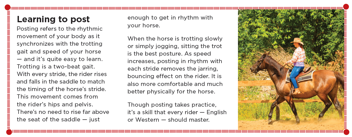 Believe it or not, the two riding styles aren’t all that different either. Posting is a good example of this (see sidebar below). Perhaps you’ve been told you that English riders post and Western riders sit the trot. I don’t believe this is true. Any good rider, regardless of his/her discipline or tack, should learn to post and be comfortable posting when the horse extends his trot. This is better for your horse physically, and will ultimately be more comfortable for you, the rider.