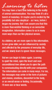 What is your horse telling you? Speaking to your animal companions for the first time is very exciting, and when you hear their voices and listen to their wisdom, your life will change forever.