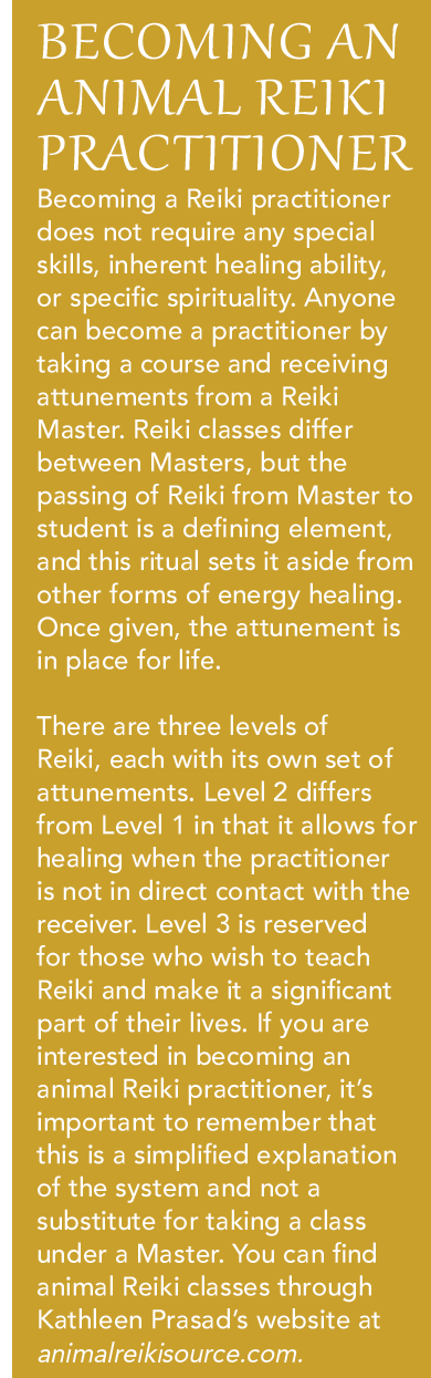 There is no downside to using Reiki as a complementary treatment modality for dogs and cats. It is gentle, painless, non-invasive — and as long as proper consent and technique is used (see sidebar above) — stress-free and safe for animals. Reiki’s healing energy will go where it is needed in the dog or cat’s body and can be used from a distance, making it ideal for animals in a variety of settings such as veterinary clinics, grooming centers, rescues, shelters or training facilities.