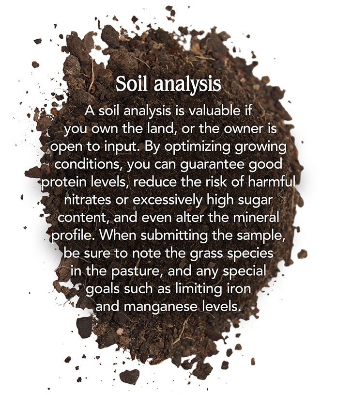 Once you’ve decided that the pasture has the potential to meet your specific needs, it’s a good idea to have it analyzed to confirm good energy and protein levels, as well as determine the mineral profile. Mineral deficiencies and imbalances, especially of important trace minerals like iron, copper, zinc, manganese and selenium, are extremely common.