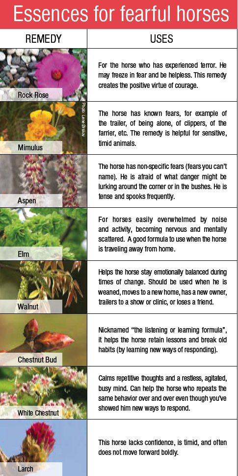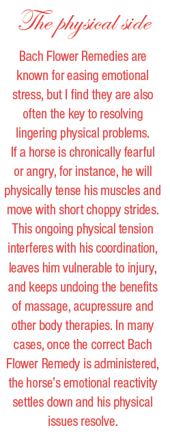 Watching Timothy transform literally overnight sent me on a quest to learn more about Bach Flower Remedies. Since that day almost 25 years ago, I’ve used them to calm frightened and injured animals, lift the spirits of abused or sick horses, build confidence in performance horses and tone down belligerent pasture bullies. I’ve mixed formulas that help horses (and their owners) cope with allergies, fear of trailer loading and stage fright during competition. The essences have helped an orphan foal move out of depression and an older horse reclaim his place in the herd.
