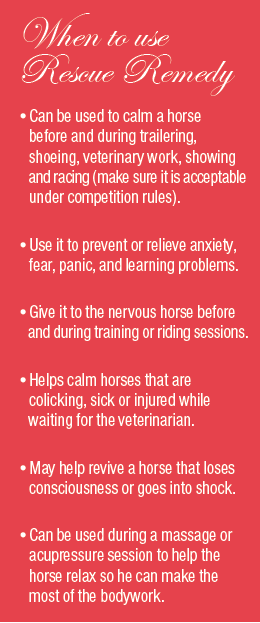 To help your horse overcome a pattern of behavior that he or she has had for a long time, dose him two to four times a day for at least one to two weeks before assessing the value of the remedy. I like to dose the horse during training and bodywork sessions, and put it in the drinking water.