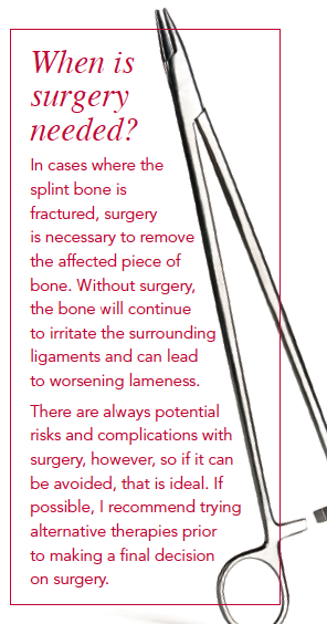 • If there is lameness present, or the pain or swelling is more severe than your veterinarian usually sees with a mild splint, x-rays will be necessary to rule out a fractured splint bone. In most cases, splints are mild and x-rays are not necessary, but when in doubt, have the diagnostics done so you know what you’re dealing with and how to treat it.