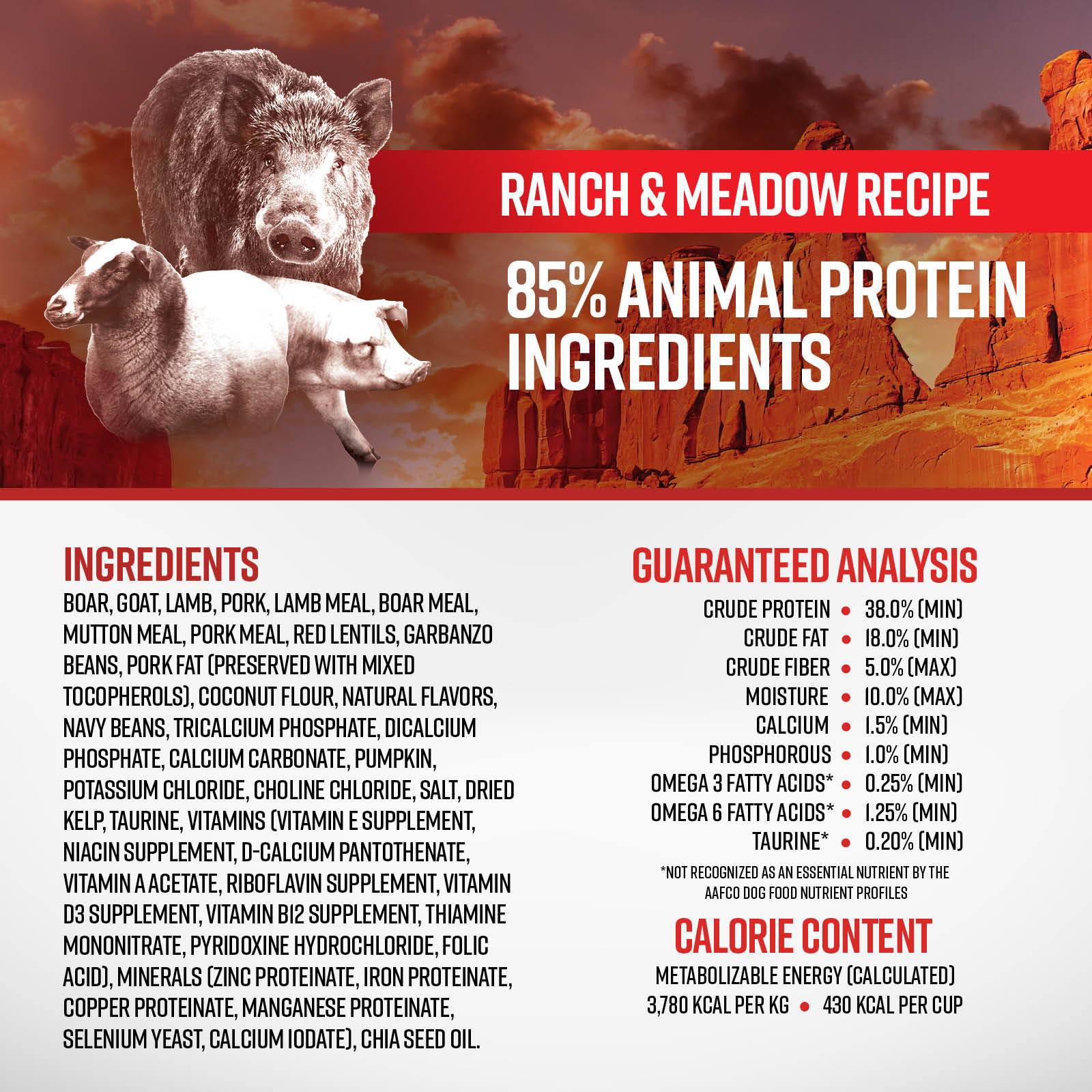 Ingredients on your pet’s food label are listed by quantity – in other words, the ones that appear first are the predominant ingredients in that food. The dog food you’re considering should have a meat protein listed as the first ingredient as opposed to a grain or vegetable. If the second ingredient is a protein or protein meal as well, that’s even better! An example of a company that exceeds this standard is Essence Pet Foods, in which the first five ingredients are a protein or a protein meal (see image at right).