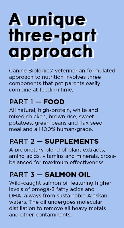 Because of the careful formulation and balance of the diet and its ability to support canine health, this unique system is ideal for dogs fighting cancer, as well as other dogs in need of additional nutritional support. An online Nutrition Plan Builder lets pet parents input their dog’s information so that an individual diet can be created for them, and then a 30-day supply – shipped once or on a subscription-basis – is delivered directly to their door. “They can cancel their subscription plan at any time, for any reason, and receive a full refund for any unopened food, oil or supplements returned to Canine Biologics,” says Jeff.