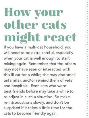Your cat may need medication or other remedies on a regular basis; depending on the situation, she may also need physiotherapy. Your vet will tell you what needs to be done, so you’ll need to make a plan to fit your cat’s care into your schedule; and, if possible, let someone else in the household know what needs doing so they can take over if you are not around. One of my cats needed medication four times a day, along with regular physiotherapy, when she first came home after surgery. I quickly realised it would be impossible for me to go out for a whole day and still fit her care into my schedule. So I cancelled some outings, and arranged for someone else to help out when I couldn’t be there.