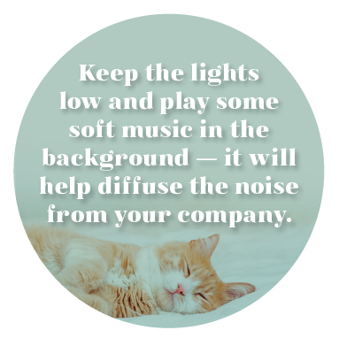 - Create a comfortable haven in a bedroom or spare room with her litter box and some special new toys. Keep the lights low and play some soft music in the background – it will help diffuse the noise from your company.
