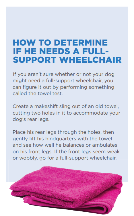 - A full-support wheelchair bears a strong resemblance to a rear-support wheelchair except that it includes an additional, smaller pair of wheels near the dog’s front legs, as well as a sling to support the his midsection.