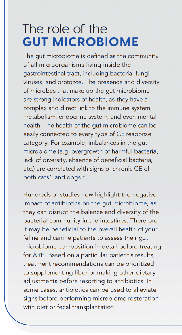 Because CE is a broad term with numerous causes, it’s not surprising that 15% to 40% of cases do not respond to treatment in the short term.26 If a patient is non-responsive to treatment, it is possible that another disease or condition could be contributing to signs. For example, pets can still have a cobalamin deficiency, despite an adequate diet, due to malabsorption as a result of an unbalanced gut microbiome and mucosal inflammation. That said, not all the causes of CE are understood, let alone known. Altering the gut microbiome is an emerging and promising treatment for clinical signs of a gastrointestinal condition, even when the cause is unknown.
