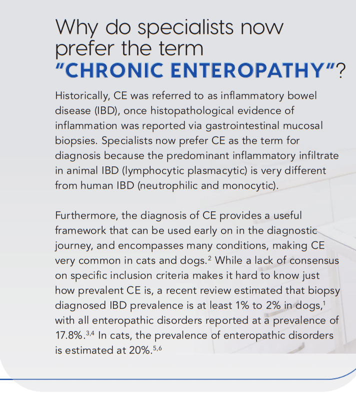 Chronic enteropathy (CE) is the term now used to describe long-term GI disease that lacks a specific diagnosis in canine and feline patients.