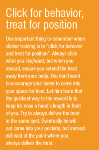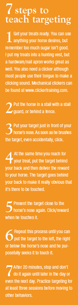 Horses new to clicker training are taught targeting by first putting them in a stall, behind a fence or with something between them and the trainer. This is because horses can get very excited about the food, and that’s what causes many people to give up. Teaching your horse not to mug for food is another training task.
