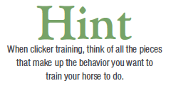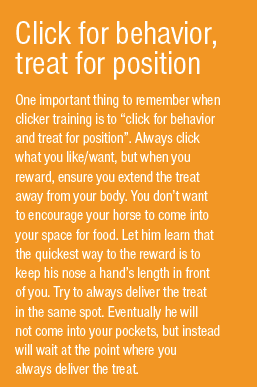 The clicker method is a progressive system that builds on previous tasks. First, you teach the horse what the sound of the click means by pairing it with a reward, most often food. The only other higher-value reward is safety; in order to use safety as a reward, however, you first need to threaten the horse, which is why it’s best to use food instead.
