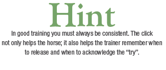 Anyone who has the desire can learn clicker training. It does, however, involve thinking in a different way. Clicker training is not about punishment; it’s about reinforcement. It provides you with a way to give your horse a paycheck every time he “gets it right”. It’s about looking for the positive, ignoring the unwanted, and finding ways to say “yes” to your horse instead of “no”.