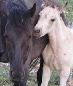 Within a few hours of birth Dusty totters at his mother’s side to a nearby snow bank where the mare eats mouthfuls of melting show. Cloud and his grulla filly join them. The grulla, like the duns, are primitively marked horses, reminiscent of the ancient horses that may have roamed this country 10,000 years ago before a massive mammalian die off. The horse returned to its native home with the Spanish in the 1500s when they conquered Mexico and South America.