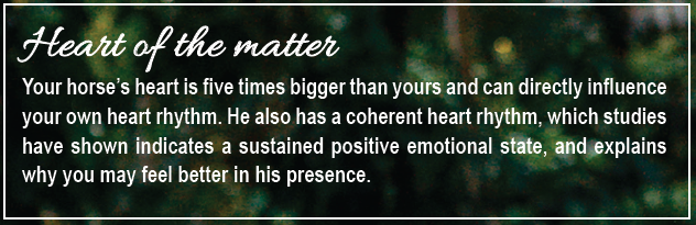 The practice of Pranayama (breath control) helps you calm down, increase focus and unify your energy with your horse’s. Breathing in rhythm with his respiration rate has a calming effect on both your nerves and emotions, and can help you connect on a subtler level.
