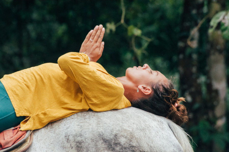 The practice of Pranayama (breath control) helps you calm down, increase focus and unify your energy with your horse’s. Breathing in rhythm with his respiration rate has a calming effect on both your nerves and emotions, and can help you connect on a subtler level.