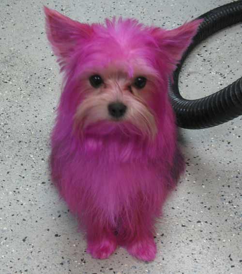 Most professional groomers enlist the use of true semi-permanent dyes for creative coloring. Your first clue that a groomer has NOT been properly educated is the use of the term ”vegetable based dyes”. There is no such thing as a “vegetable based” dye. This is a misnomer used by groomers who attempt to fool you into thinking they know what they’re doing. It’s true that some pigments are derived from vegetable sources, but their molecular structure has been altered and they are no longer ‘vegetables’. This term is often used for products such as Manic Panic, a human labeled semi-permanent dye. Don’t get me wrong, Manic Panic is one of the safest dyes available for use on pets, but it is a “conditioner based” dye. Conditioners make up the ‘base’ and various pigments are added to create a dye.