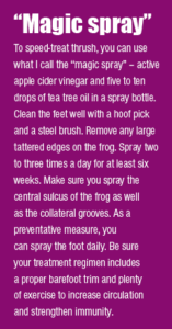 Thrush is at epidemic proportions in our horses yet no one seems to notice! It’s so common it’s either not recognized or is perhaps accepted as normal. Every barn has bottles of chemical treatments on hand for their never-ending battle against thrush. Wouldn’t it be great to never have to smell, see, or worry about it again?