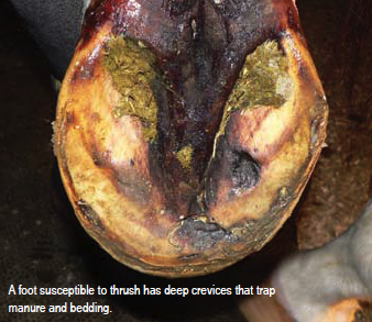 • What do you see? When cleaning and inspecting your horse’s feet, are they the picture of health with a clean distinction between parts? The ideal foot will have wide, thick, calloused, uniform frogs that blend into wide, smooth heel bulbs – smooth, shiny soles – and clear white line connections. Or maybe you see some warning signs of a foot susceptible to thrush: chalky, flaky sole – tattered, black frog – deep crevices that trap manure and bedding.