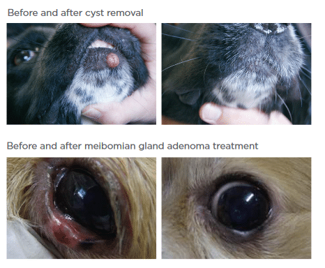 - Meibomian gland adenomas: For meibomian gland adenomas measuring 1mm or less, my preferred initial treatment option is cryosurgery over surgical excision. These common eyelid masses are full thickness proliferations often filled with a material that can be expressed with gentle pressure. I would suggest treating the tissue with cryotherapy from both palpebral and ocular sides to ensure all abnormal tissue is treated. There is little to no cosmetic change after healing.