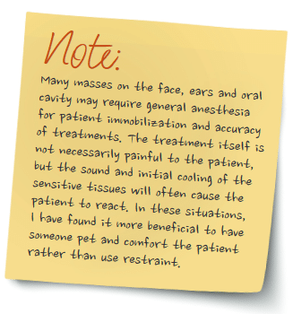 Prior to cryosurgery implementation, it is imperative that current standards of care be followed, with appropriate cytological and histopathological diagnostic steps performed as indicated. If a mass is deemed malignant with metastatic potential, addressing the mass with aggressive surgical intervention, radiation and chemotherapy would be indicated based on oncologist recommendations should the patient’s owner elect to pursue that line of treatment. Once a mass has been diagnosed, the use of cryosurgery can be employed for nearly any lesion on the skin, as well as some mucus membrane tissues.