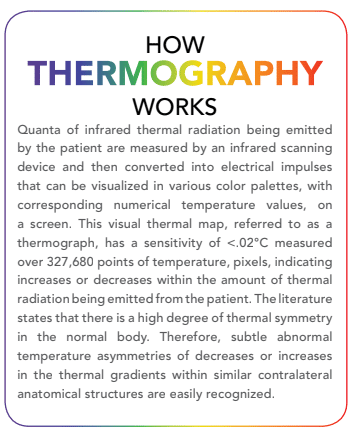 Interpretation of the thermal images is not difficult. Any increase or decrease of >1.0°C within the thermal symmetry of contralateral anatomical areas is significant. Areas depicting an increase (hyperthermic) or decrease (hypothermic) in thermal asymmetry require further evaluation and possibly further diagnostics. Areas of hyperthermic activity correlate to an inflammatory process, resulting in an increase in blood flow, whereas areas of hypothermic activity correlate to a vasoconstrictive state usually in response to a dysfunction within the sympathetic nerve pathway to the vasculature.