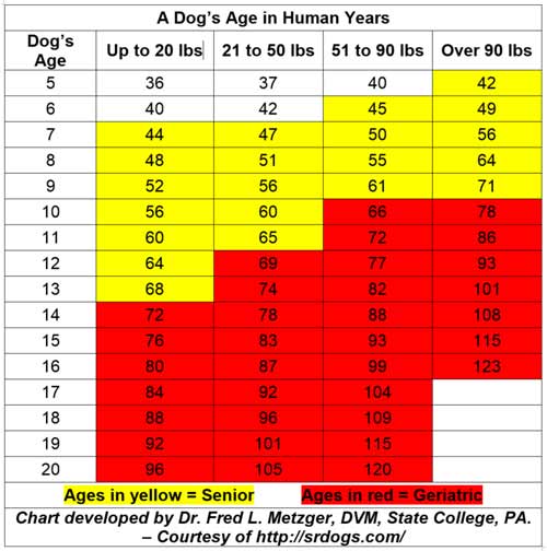 Here is a great chart to help you better understand how old your dog may be based on his or her size.A dog's age in human years may differs based on his size.