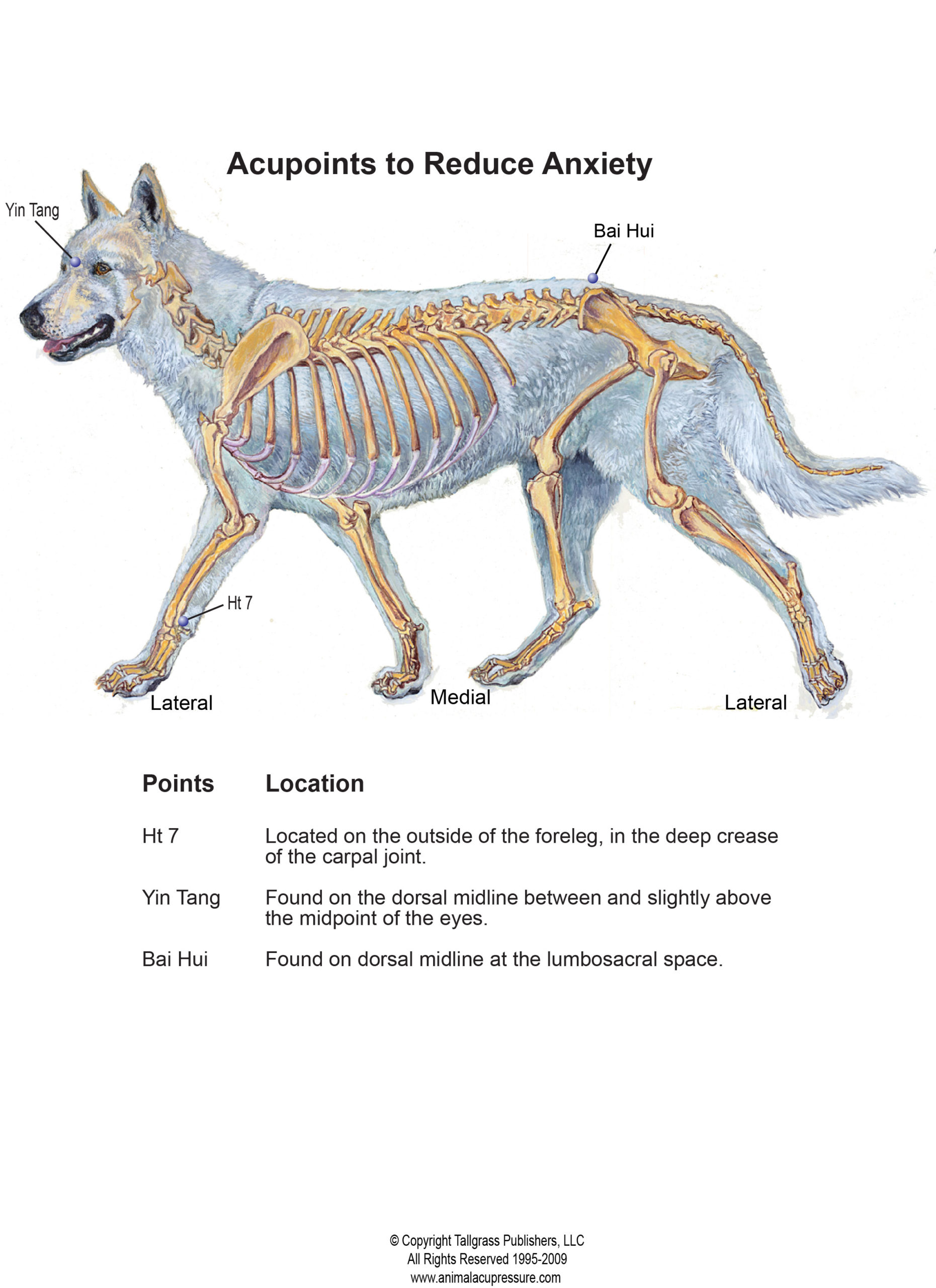 Anxiety is an important emotion in our dogs. This may sound counterintuitive, but anxiety is actually a healthy protective mechanism, an anticipatory response to a perceived threat to the dog’s survival. Problems only arise when the dog is overly anxious or not anxious enough. Either extreme is harmful, and can be potentially destructive. Acupressure is an effective way to calm a dog who’s on the too-anxious end of the scale.