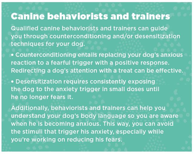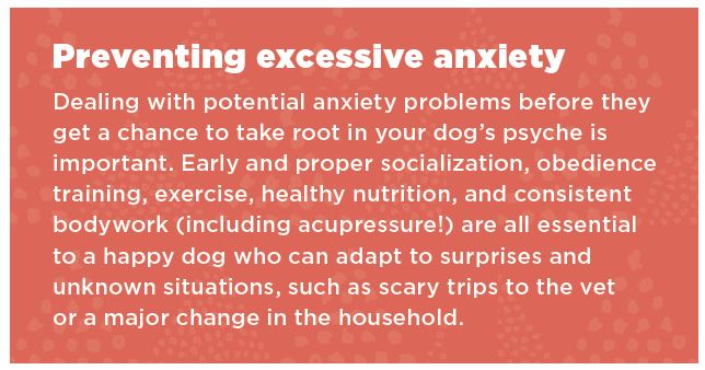 Your holistic veterinarian is the best place to start. He or she can make sure your dog is not suffering from a physical injury or disease that may account for his heightened anxiety. Once health issues are ruled out, your vet may direct you toward an integrative approach to helping your dog. Working with a canine behaviorist and/or trainer (see sidebar above), along with using complementary therapies — such as acupressure — are shown to have a positive outcome.