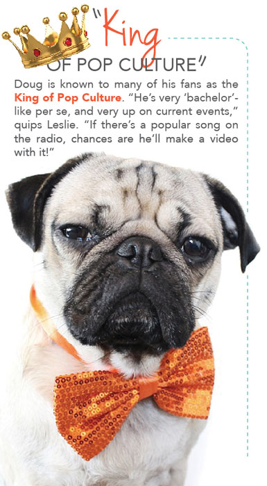 Leslie adds that Doug has always been very photogenic. “A lot of my friends pushed me to get an Instagram account for him when he was a puppy, but I stuck to simply posting funny photos of him on my personal account,” she says. “My account began to grow as a result of Doug’s photos, and I quickly realized that people wanted to see more of him. As soon as I started a dedicated Instagram account for him it grew like wildfire. Doug now has over 1,000,000 followers across Facebook, Twitter, and Instagram.” He even stars in his own videos and has his own YouTube channel. “I think people are so attracted to him because they feel like they can relate to him. His personality shines through his photos and captions. My main goal with Doug is to make people smile.”