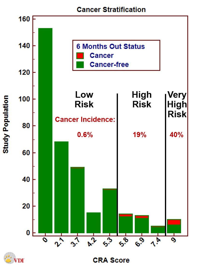 Taking the data from the clinical study, the CRA score was developed. CRA is a unitless index from 0 to 10 where 0 is a perfectly healthy, no cancer no inflammation dog, and 10 is a perfect score for cancer. As systemic inflammation increases and abnormal cell replication appears, cancer risk increases.