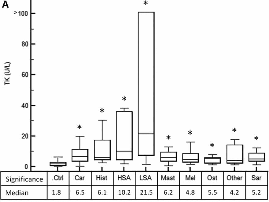 1Selting, K.A., Ringold, R., Husbands, B. and Pithua, P.O. (2016), Thymidine Kinase Type 1 and C-Reactive Protein Concentrations in Dogs with Spontaneously Occurring Cancer. J Vet Intern Med, 30: 1159–1166.