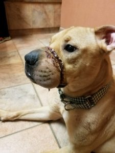 Emerald was taken to a high kill shelter where she was placed on the euthanasia list. Luckily, a board director at Outcast Rescue found “Emmie”, as they call her, before it was too late. Emmie was rushed to Crown Veterinary Specialists in Lebanon for emergency medical treatment. She was immediately put on antibiotics to bring down the infection and swelling, and was scheduled for surgery the following day.