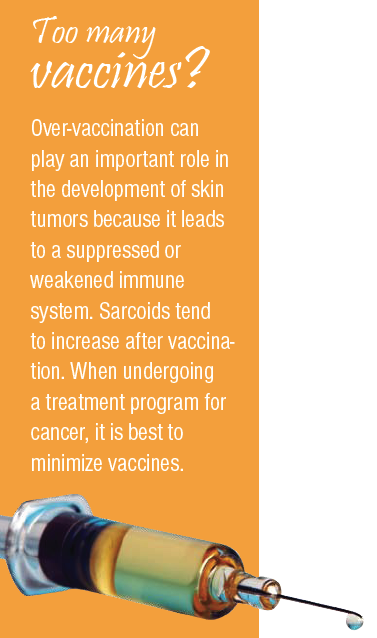 Homeopathy – From the homeopathic perspective, a tumor is an expression produced by the vital force or energy of the body, basically complaining that there is a problem with the body. When a tumor keeps recurring at the same location, it indicates that the vital force is strong yet reminding you that a deep imbalance is still present. If the tumor recurs at other locations, it often means the horse is weaker at a deep level and that it may take longer, or be more difficult, to help or cure him. Having said that, a simple sarcoid may respond well to a few doses of a homeopathic remedy, such as Thuja Occidantalis or Causticum. If you are not familiar with homeopathy, please consult a homeopathic veterinarian.