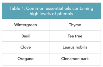enzyme and have developed other enzymatic pathways.10,11 A knowledge of which essential oils are safe for cats, and how they can affect physiological body systems, is necessary to properly utilize them. Essential oils with high level of phenols should not be used, or if needed, used with extreme caution and under the guidance of a veterinary aromatherapist. Table 1 lists some of the most common essential oils with a high phenol content.