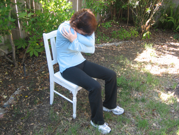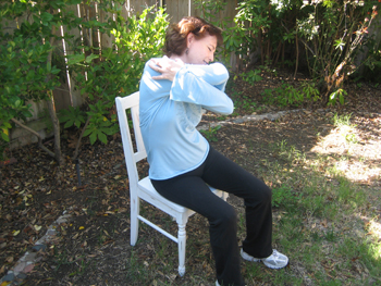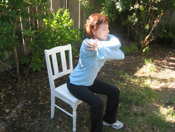 11. Cross your arms with the right arm on top. Hold your elbows straight out in front of you and move your body in a circle. I like to pretend that I have a large spoon hanging from my crossed elbows and I’m stirring a big pot of soup. As you “stir the soup”, feel how you shift your weight on your pelvis. Feel where it’s natural to round your back and shift onto the back of your seatbones. Then feel where you lift one side of your pelvis off the chair, followed by arching your back as your elbows reach out in front of you. Do several circles in each direction, then lower your arms and rest.