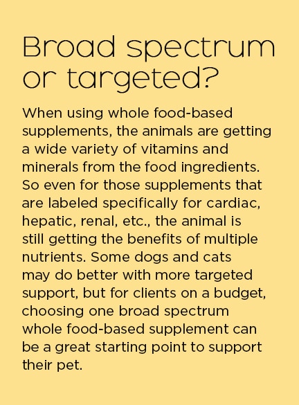 When it comes to the “ideal” diet for dogs and cats, opinions vary widely. Some feel that strictly dry kibble is best while others stretch to the other side of the spectrum and prefer a raw or fresh food diet. Regardless of what diet you are recommending for your patients, there is potential for benefit from the addition of whole food-based supplements. If animals are eating the same food daily for long periods, there may be gaps in what their bodies require for optimal health. Focus on variety year-round, not just at the onset of a season, to optimize health.
