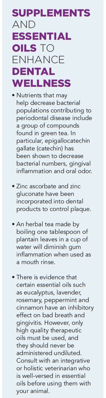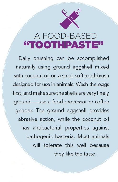 Chewing on bones and toys provides the mechanical abrasion necessary to decrease plaque accumulation on the teeth. Animals should have at least one or two chewing opportunities per day. Hard biscuit-type treats did not improve dental health in veterinary studies.