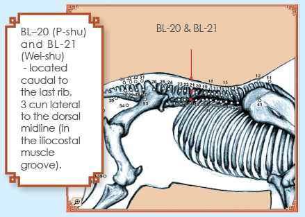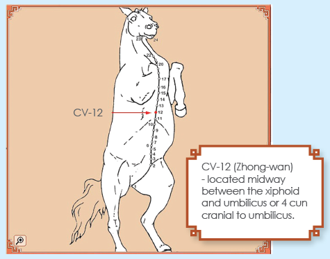 If the results of this acupressure session are unclear, try applying pressure to BL-20 and 21. Reactivity at these points will cause the horse to ripple his back under and away from your thumb. If these points are reactive along with ST-7 and CV-12, it’s a very good idea to proceed with ulcer treatment.