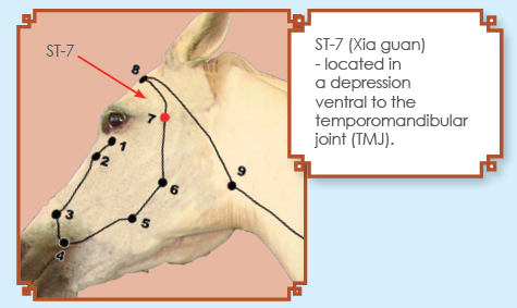 When reactive, acupressure points Stomach-7 (ST-7) and Conception Vessel-12 (CV-12) are excellent indicators that gastric ulcers may be present. Reactive means the horse pulls away or “flinches” when the points are evaluated. If the horse is only reactive at ST-7, or on only one side, it suggests a possible Temporomandibular Joint (TMJ) issue and indicates a good reason to consult an equine dentist. But if the horse is also reactive on CV-12, ulcers might be the culprit.