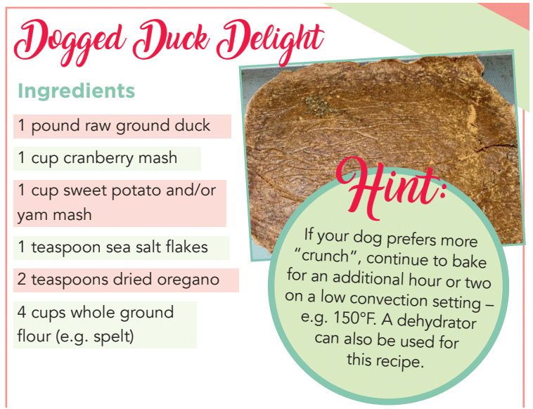 Cover a cookie sheet with parchment paper. Combine all ingredients in a large mixing bowl. A wooden spoon works perfectly for this recipe. Transfer dough to the middle of the parchment paper, pat it down, and draw it out to the edges with your fingers. Place the cookie sheet in a cold oven and turn the heat to 350°F on the convection setting. When the oven reaches heat, turn it down to 200°F and bake for one hour. Remove the cookie sheet from the oven, turn the Dogged Duck Delight over, and return it to the oven for one more hour. Turn off the heat and allow the leather to cool completely before taking it from the oven and storing in an open container in the fridge. This treat can also be frozen.