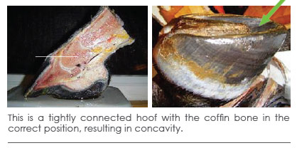 This natural secure attachment holds the internal structures of the hoof in place where they are meant to be – high up inside the hoof capsule, creating a bowl or concaved shape on the sole. This solar concavity occurs naturally in a healthy, well connected hoof and represents correct anatomy. The coffin bone is not flat, but instead has an arch to it. The external structure of the hoof mimics the internal structure. As the horse grows and develops, this tight connection remains strong and intact unless there a toxic insult to the horse’s system that results in laminitis.hoofbone