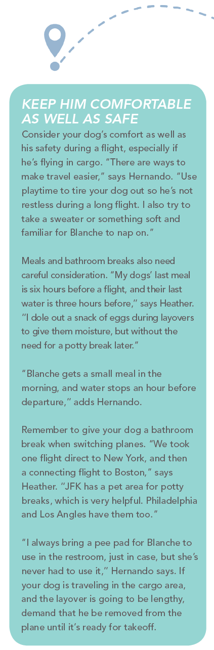 “Some airlines make it difficult,” says Hernando Umana, who frequently travels with his seven-year-old Shih tzu, Blanche. Last year, they were in the air nearly once a week, visiting about 30 states, so they’re both seasoned flyers. “I like the airlines with clear simple rules,” Hernando adds. “My favorites are Delta and Jet Blue. I always triple-check to make sure they know Blanche is flying with me.”