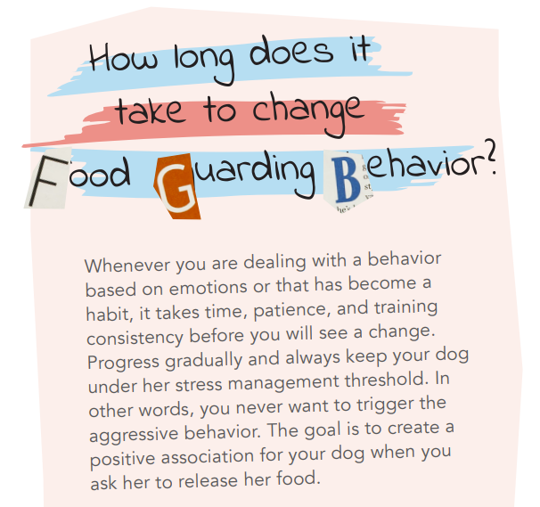 - Don’t rush; practice a little bit every day. If at any point your dog shows even the mildest guarding behavior, go back to the point at which he was relaxed and gradually progress from there.